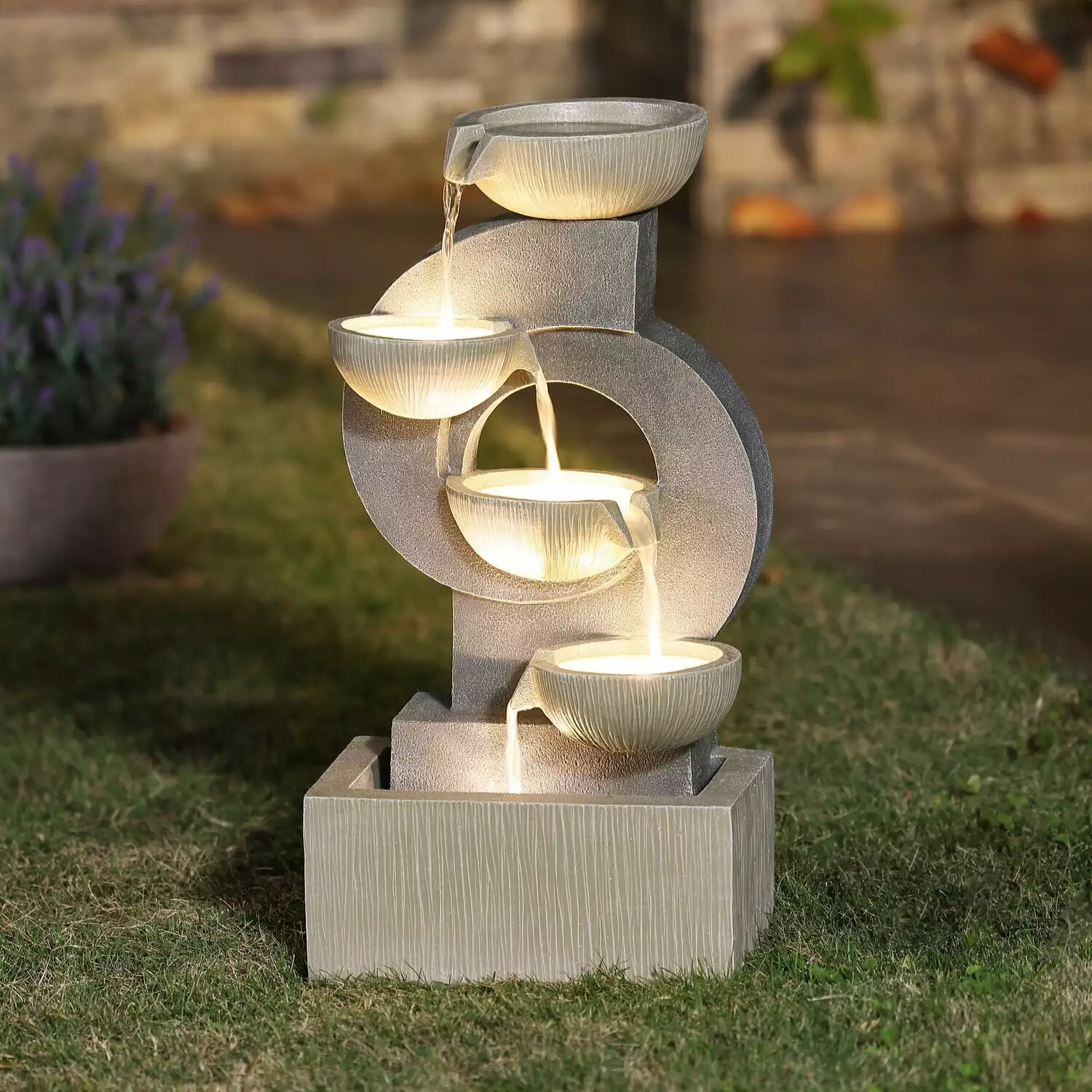 This fountain turns your backyard into an outdoor spa with its shapely modern design and tranquil effect. The cream-colored and gray poly-resin fountain body invokes calm feelings with its soothing tones. creating a relaxing atmosphere for unwinding at the end of a long day. Listen to the water pool before it overflows and cascades down to the next tier. The electrical fountain pump also powers the four lovely accent LED lights inside the fountain. Enjoy the relaxing sound of the cascading water while the light gently reflects off the fountain and waterfall. The 23.35 tall fountain is crafted using poly-resin for outdoor use. Water fountains bring a meditative element to your space. The fountain is easy to set up on your patio. porch. or deck.