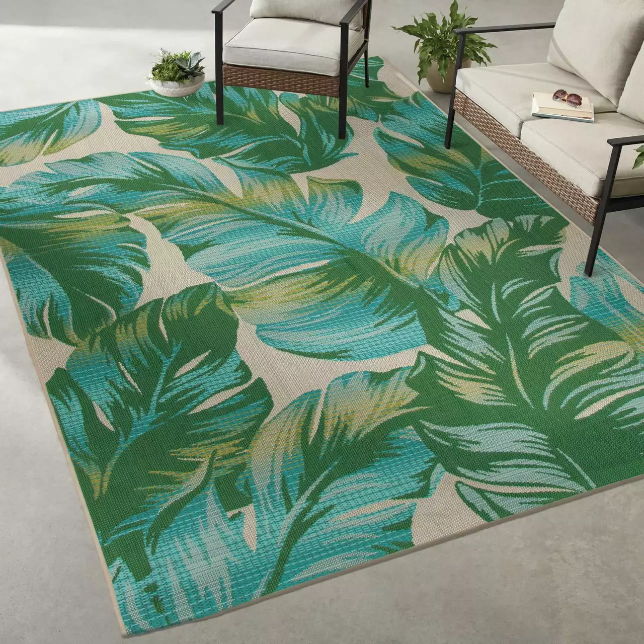 Easily create your own tropical oasis by adding this versatile Mainstays 8.5′ x 13′ White Palm Area Rug to your patio. RV. or deck. This beautifully woven piece features grasses and palms in vivid turquoise and green across a rich white/ivory background. evoking the beauty of nature and the relaxation of a seaside getaway. Decorate a busy playroom without fear of fading or staining. or make the outdoors feel a bit more like home with this versatile. durable piece. Each rug is woven of quality polypropylene and easy to clean. so you can spend more time enjoying your space and less time worrying about maintenance. Whether you’re packing up your camper for an outdoor adventure or enjoying a sunny picnic in your backyard. the stain resistant and fade resistant properties of this beautiful area rug ensure that it will maintain its rich design and exceptional quality for years to come in your outdoor living space.