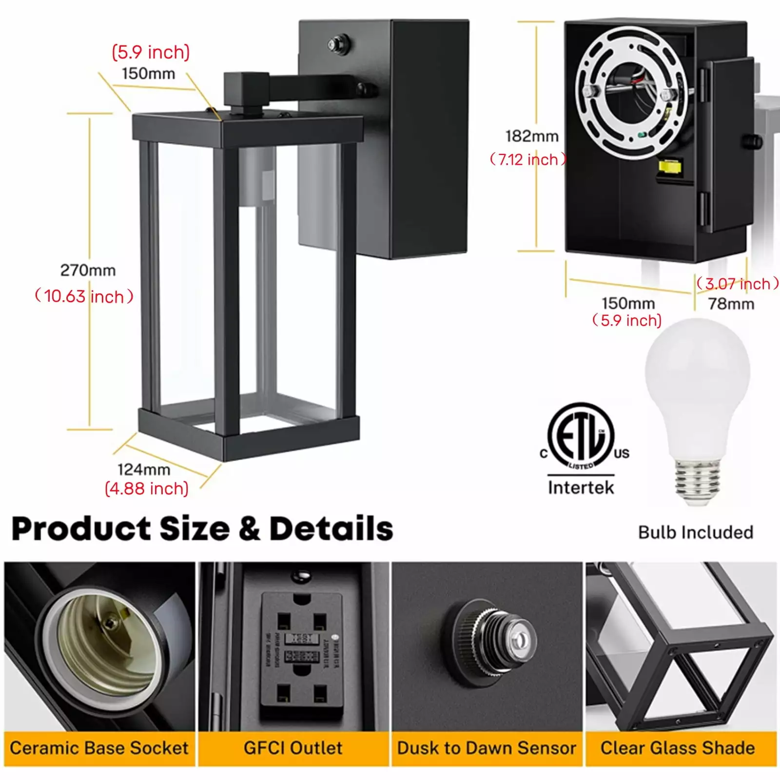 NookNova outdoor wall lantern is suitable for outdoor use. made of high-strength metal. this outdoor wall light with GFCI can withstand any severe weather. Its high-quality tempered glass is waterproof. corrosion-resistant and rust-proof. Our outdoor light fixture with built-in dusk to dawn sensor. which is auto-on at night and auto-off at daytime. Perfect for gardens. garages. porches. patios. roads. and commercial use as night security. area lighting. and more.It is also a perfect gift for friends and family!