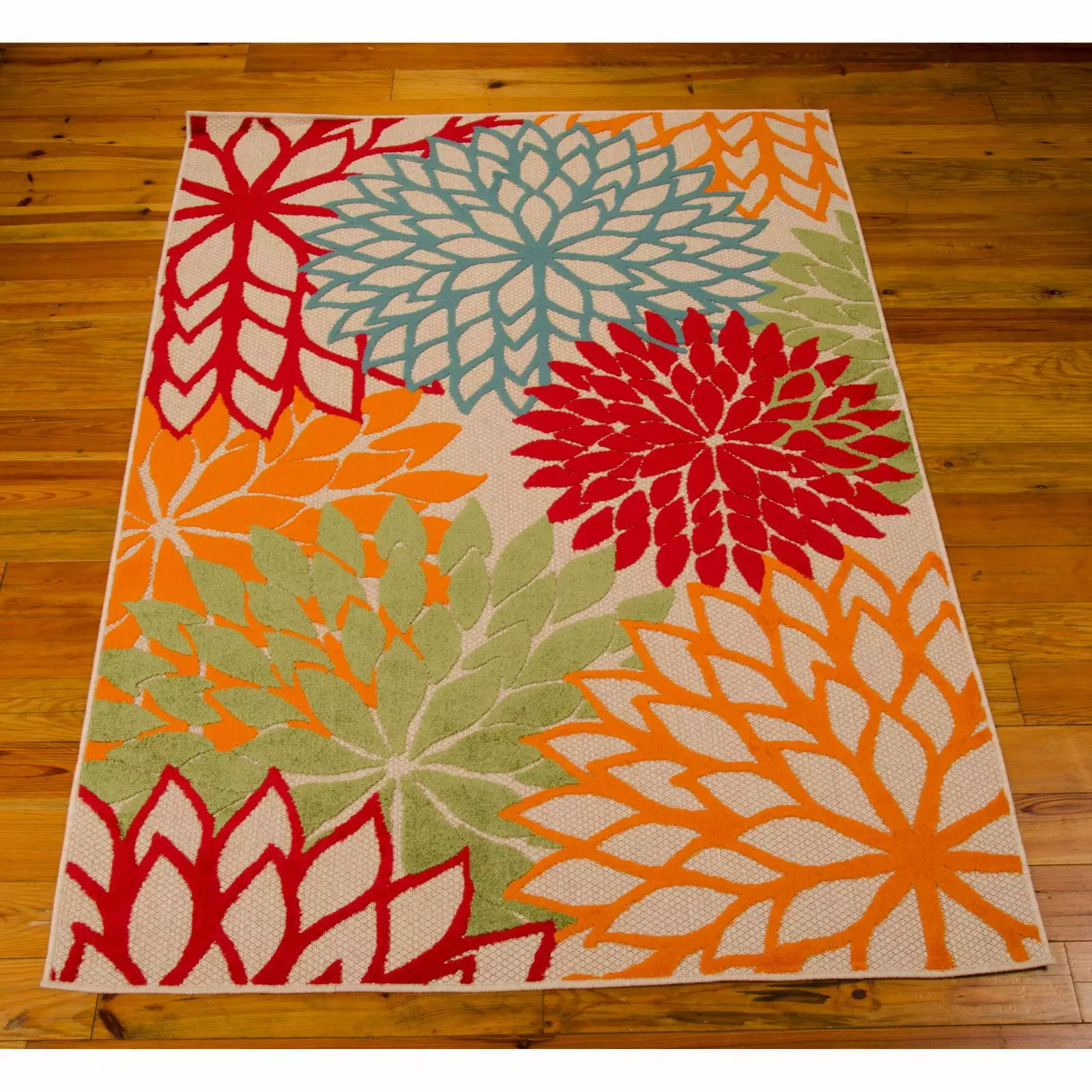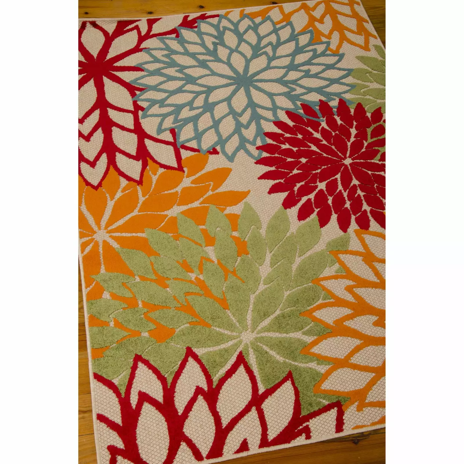 - Floral indoor/outdoor rug brings a cool tropical vibe to your home