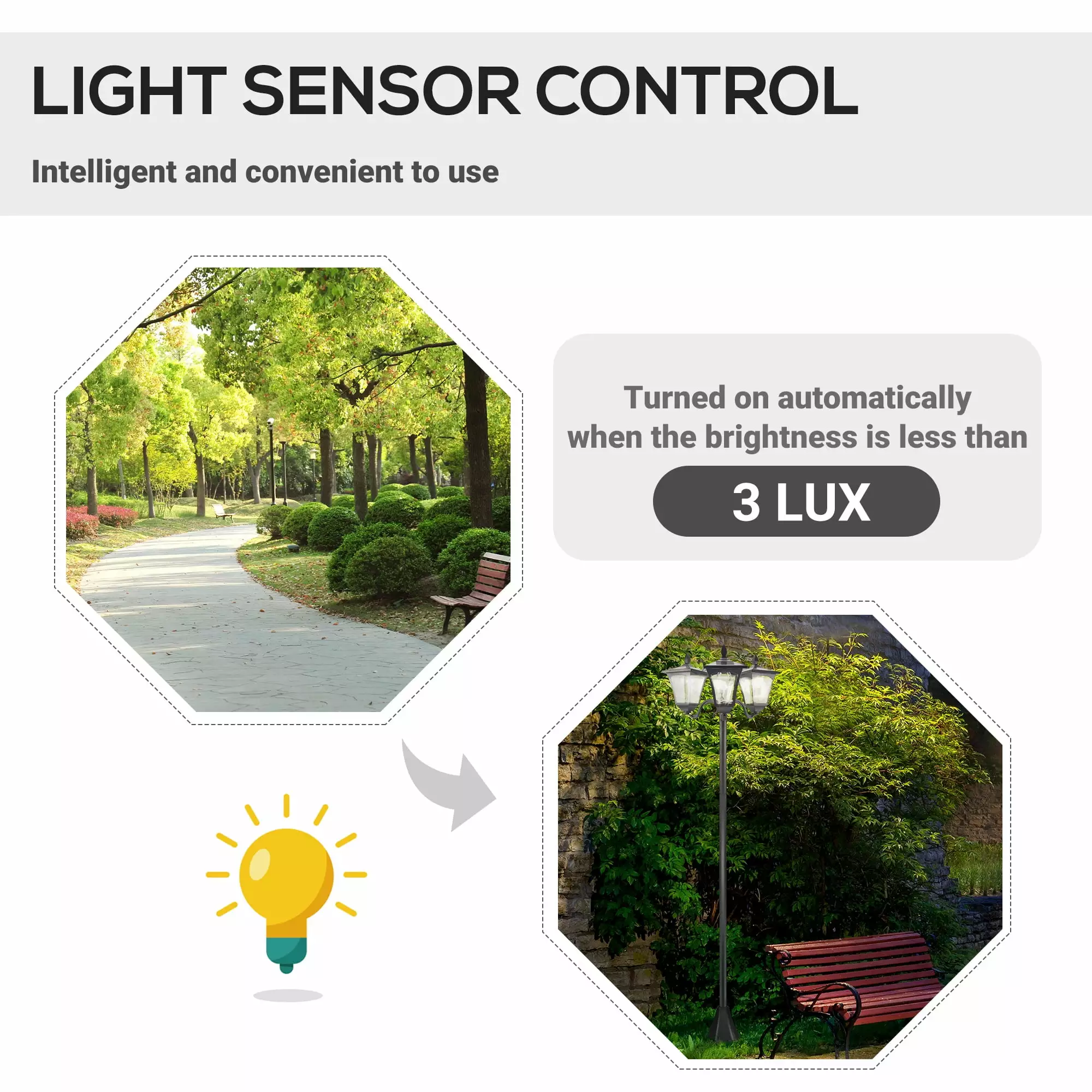 - Day Night Light Sensor: Come home to a well-lit driveway without worrying about someone flipping the light switch. This three-headed lamp post can turn on automatically when it gets dark (less than three LUX) using the power it stored during the day. Set the lights to bright. dim. or off at your leisure; they offer your outdoor space cozy lighting that’s soothing on the eyes.