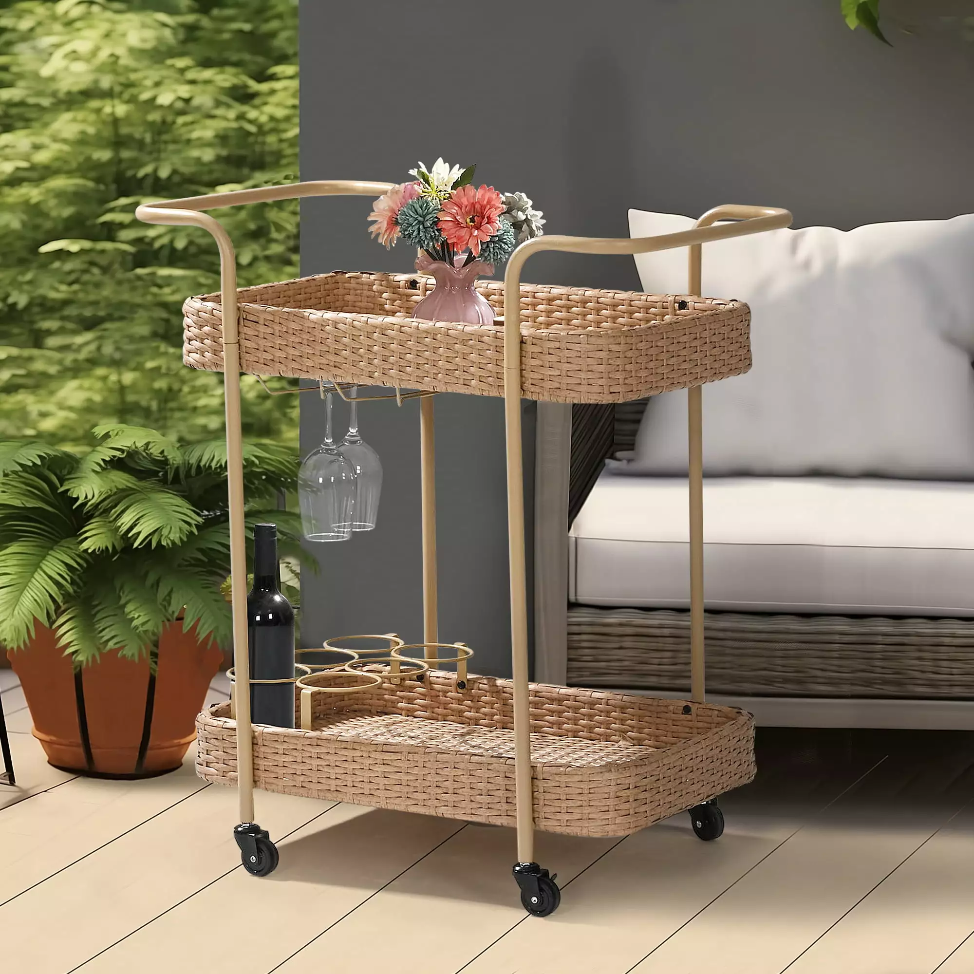 The wicker bar cart is designed to provide convenience and functionality for entertaining friends or hosting family gatherings. With 2-layer structure. the bar cart offers ample space for storing and showing party items. such as beverages. liquor. desserts. and potted succulents. The bar cart combines the modern design of rattan. effortlessly creating a captivating atmosphere for your house.