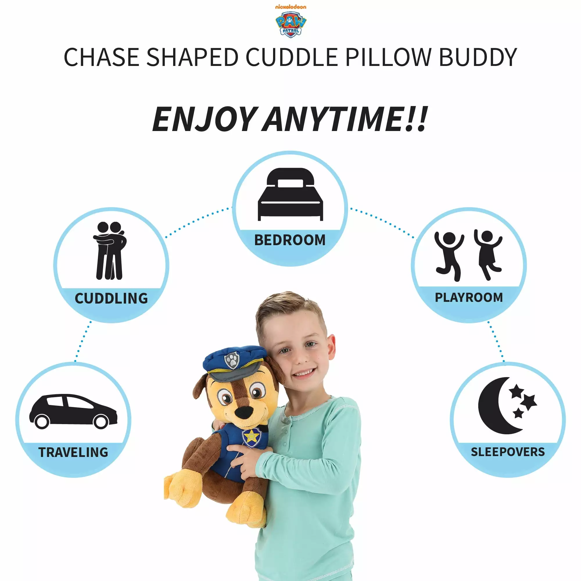 - ??PAW PATROL CHASE DESIGN: No job is too big and no pup is too small when it comes to rescue missions or bedtime comfort. Luckily. PAW Patrol’s Chase is geared up and is more than up to the task. A great cuddly accessory for young fans of the popular Nickelodeon animated series. this pillow brings the action home with help from everyone’s favorite firefighter pup. Chase.