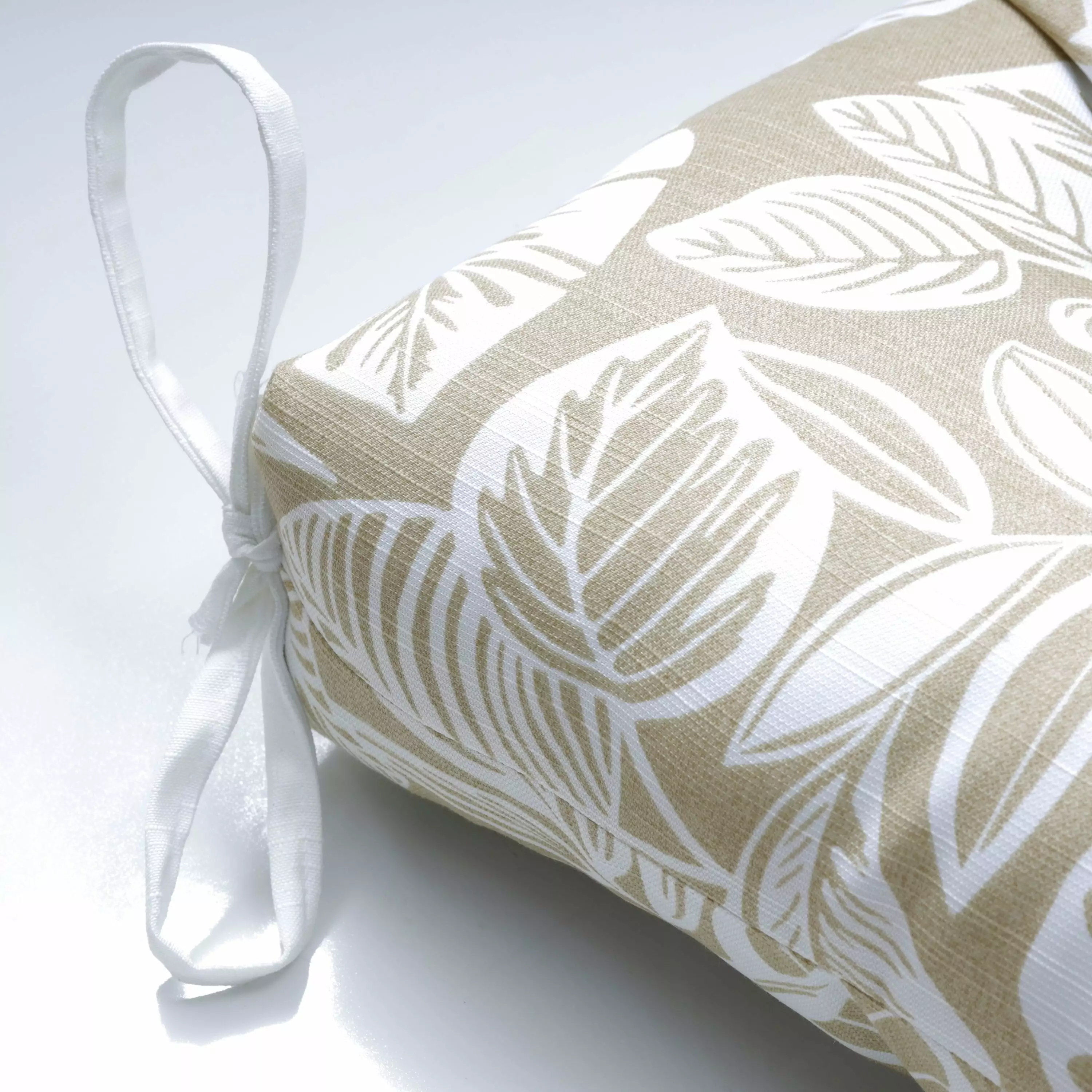 Oversized white leaves tell a monochromatic story on a natural ground with this large outdoor bench cushion. The pattern is printed on outdoor fade-resistant polyester fabric that has a slub texture for added dimension. Additional features of this large outdoor bench cushion include tufted detailing. 14-inch ties and recycled polyester fiber fill with a sewn seam closure. Also suitable for indoor use.Oversized white leaves tell a monochromatic story on a natural ground with this large outdoor bench cushion