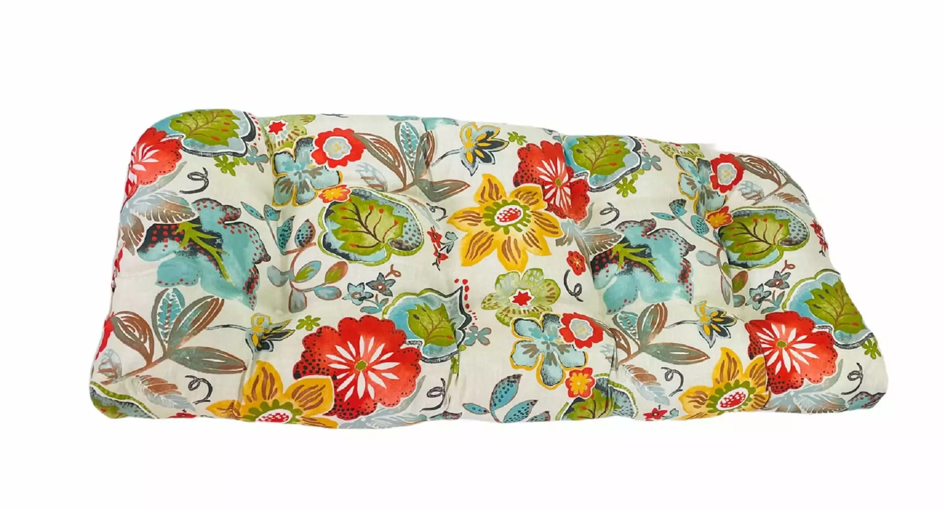 Add personality to your garden seating with these plush tufted polyester seat cushions in outdoor fashion designs and colors. Curved back U shape with no ties fits many standard chair and rocker styles. The fabric pattern is a multi-color floral on an ivory background. Polyester fabric and construction ensures water flows through with reasonable air dry time. The set includes one outdoor settee seat cushion and two chair/rocker seat cushions.