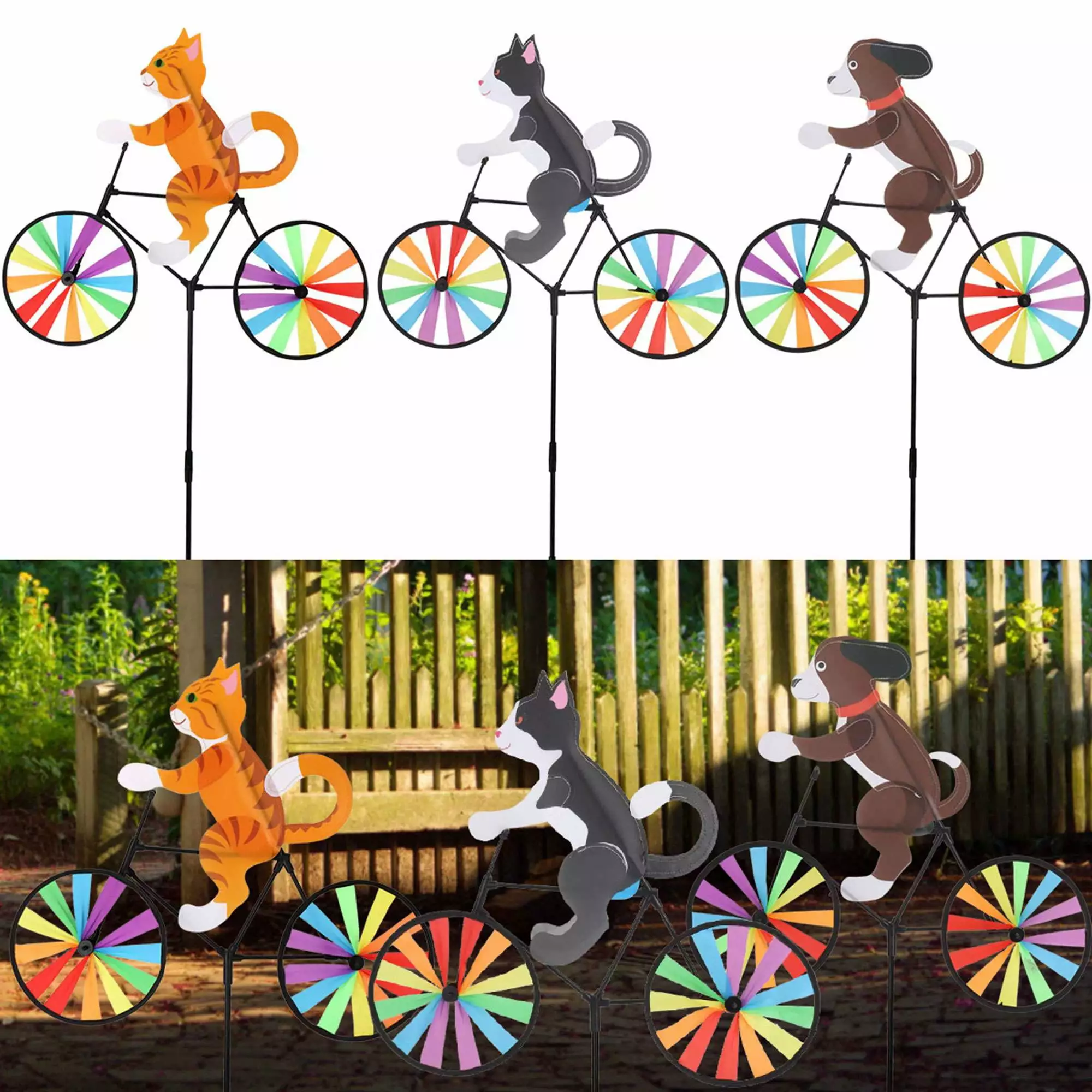 1. This lovely riding cat / dog wind spinner ornament is a fun addition to your front yard. backyard. patio or garden. The smart cat / dog sits on a bike with colorful wheels and the wheels will keep spinning in the wind that looks like the animal is really riding a bike.