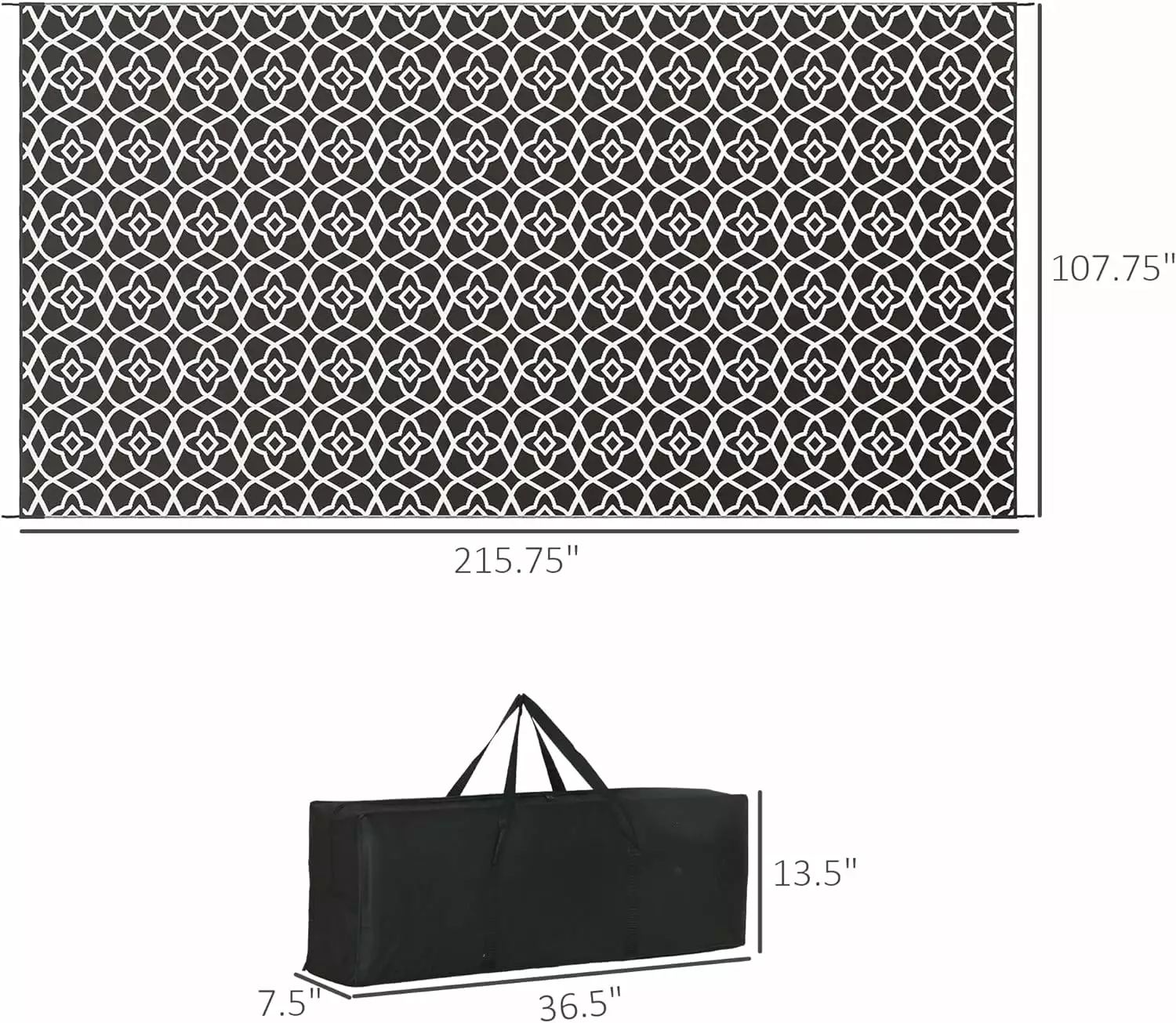 Waterproof rug for camping. picnics. or the RV;Easy to move and store with the convenient carrying bag;Reversible design with two usable sides;Reinforced edges to prevent fraying;Mount it to the ground from the four corner loops;StyleBlack and White Clover;Materials310g/m2 Polypropylene. Non-Woven Fabric;Overall Size107.75 W x 215.75 L;Carry Bag Dimensions36.5 L x 13.5 W x 7.5 H;Item Label844-808V01MXNOTEThis outside rug is not fireproof. Please keep it away from fire. ashes. and embers;