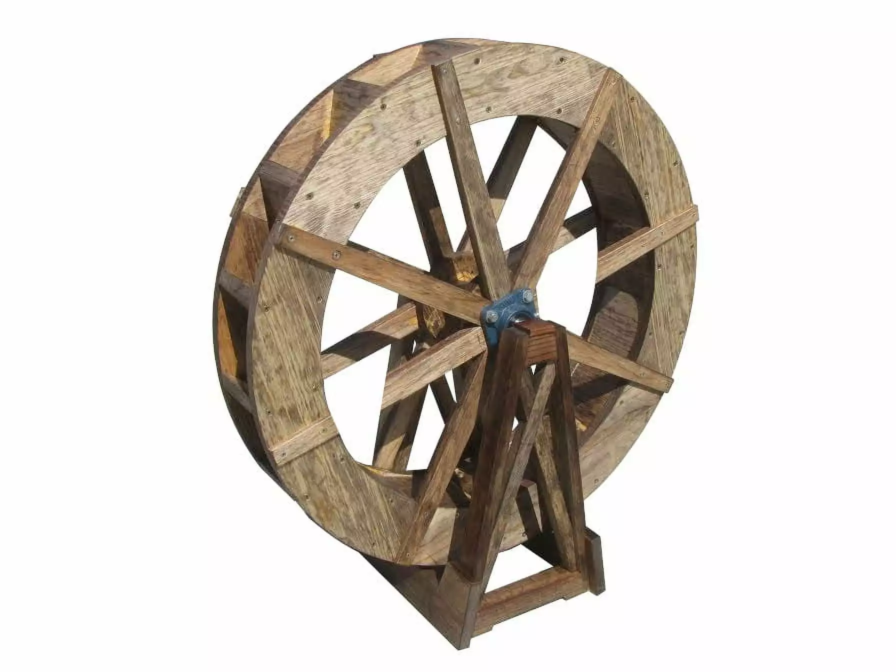 Enjoy the soothing effect of a revolving wheel and the serene sound of water. Our exclusive inter-twined construction of boat building technique leaves no joinery gaps. requires few hardware. and produces well-balanced and long-lasting wheels. Made of North American clear Pine. our water wheels revolve on a ball-bearing shaft with little flow of water. A water pump nor pond is not included.