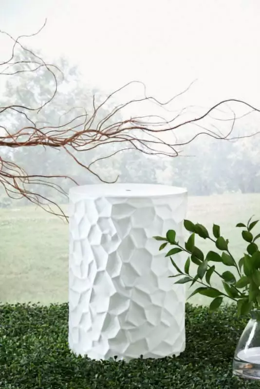 Inspired by modernist sculpture. this contemporary accent stool is an homage to the power of art. Ideal for any outdoor or indoor living space. it features bold irregular patterned sides and a minimalist matte white finish. creating an instant aura of forward-thinking flair.