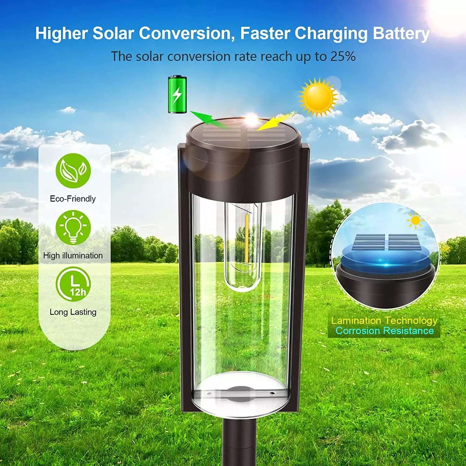 The upgraded solar path lights outdoor have larger solar panels which made by 8 monocrystalline cells. which can effectively absorb more sunlight and 30% more efficient.