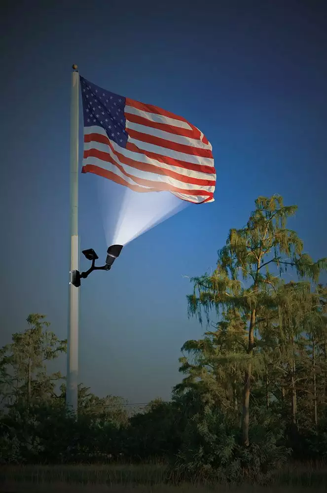 Illuminate your flag for a dramatic nighttime effect with this Solar-Powered Outdoor LED Flagpole Light from Nature Power. Heavy-duty clamps let you position it on any flagpole up to 4 in. Dia. With an adjustable solar panel. four ultra-bright LED bulbs and a rechargeable battery. it can shine for up to eight hours on a full charge. Made from sturdy plastic and aluminum. this weatherproof light automatically turns on at dusk and off at dawn for hassle-free performance.