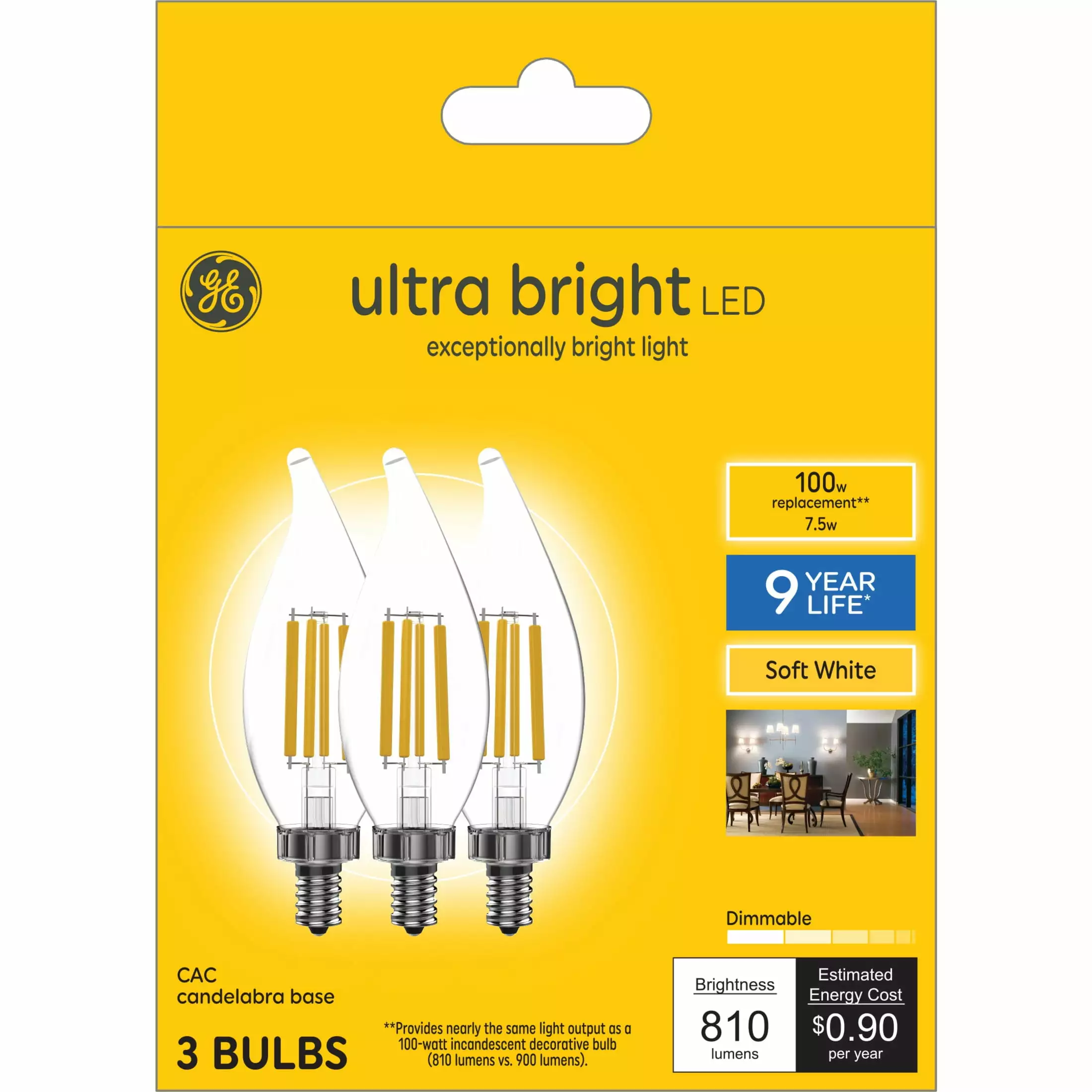 GE Ultra Bright LED Light Bulbs. 75 Watt. Soft White. CA11 Bulbs. Small Base. Clear Finish. 3pk