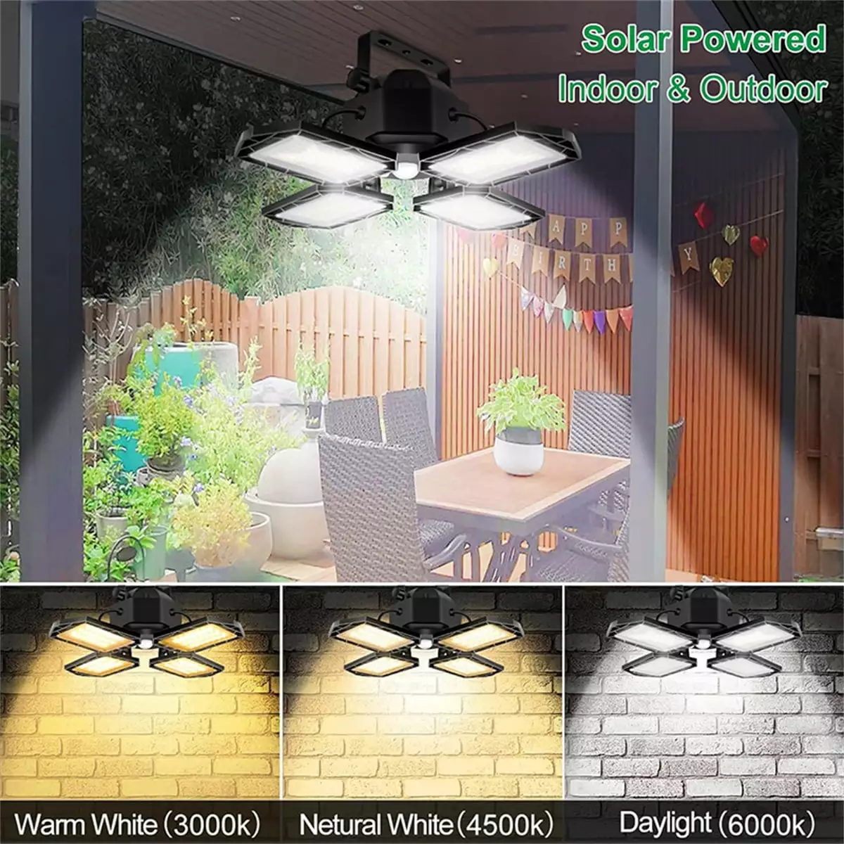 Solar Shed Lights. 168LED 5500LM Solar Pendant Light Indoor Outdoor. Motion Sensor Solar Lights with Remote Control. 4-Leaf Adjustable Lights for Home Yard Garage