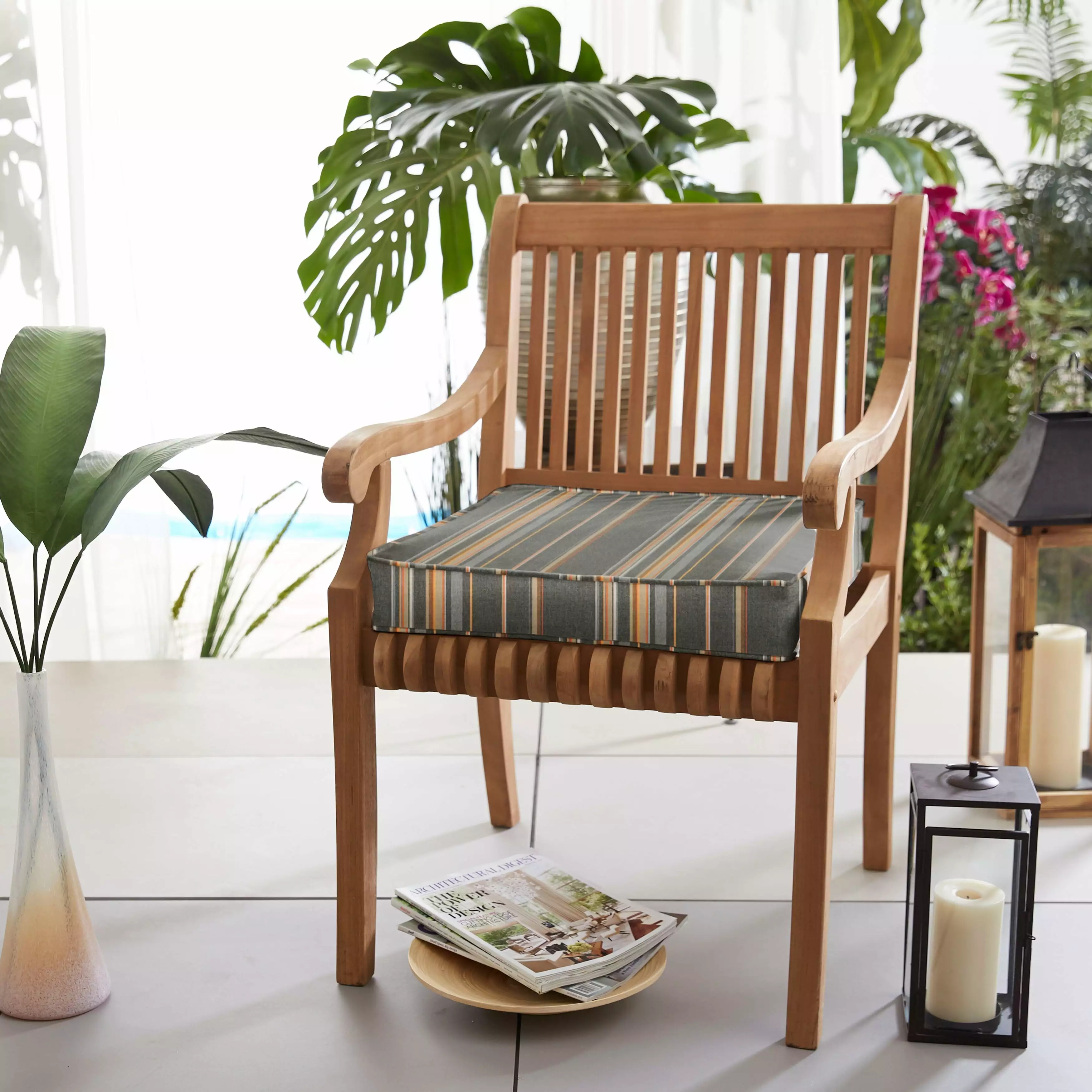 Durable Sunbrella? fabric ensures this indoor/ outdoor chair cushion will withstand the elements and stay beautifully rich and plush throughout everyday use. This decorative cushion adds extraordinary luxury and vivid flair to your patio. living room. family room. or your favorite window seat. Trimmed in matching cording and constructed with renowned Sunbrella? fabric for exceptional quality. This cushion is stain. fade. and mildew resistant and includes ties to secure to furniture.