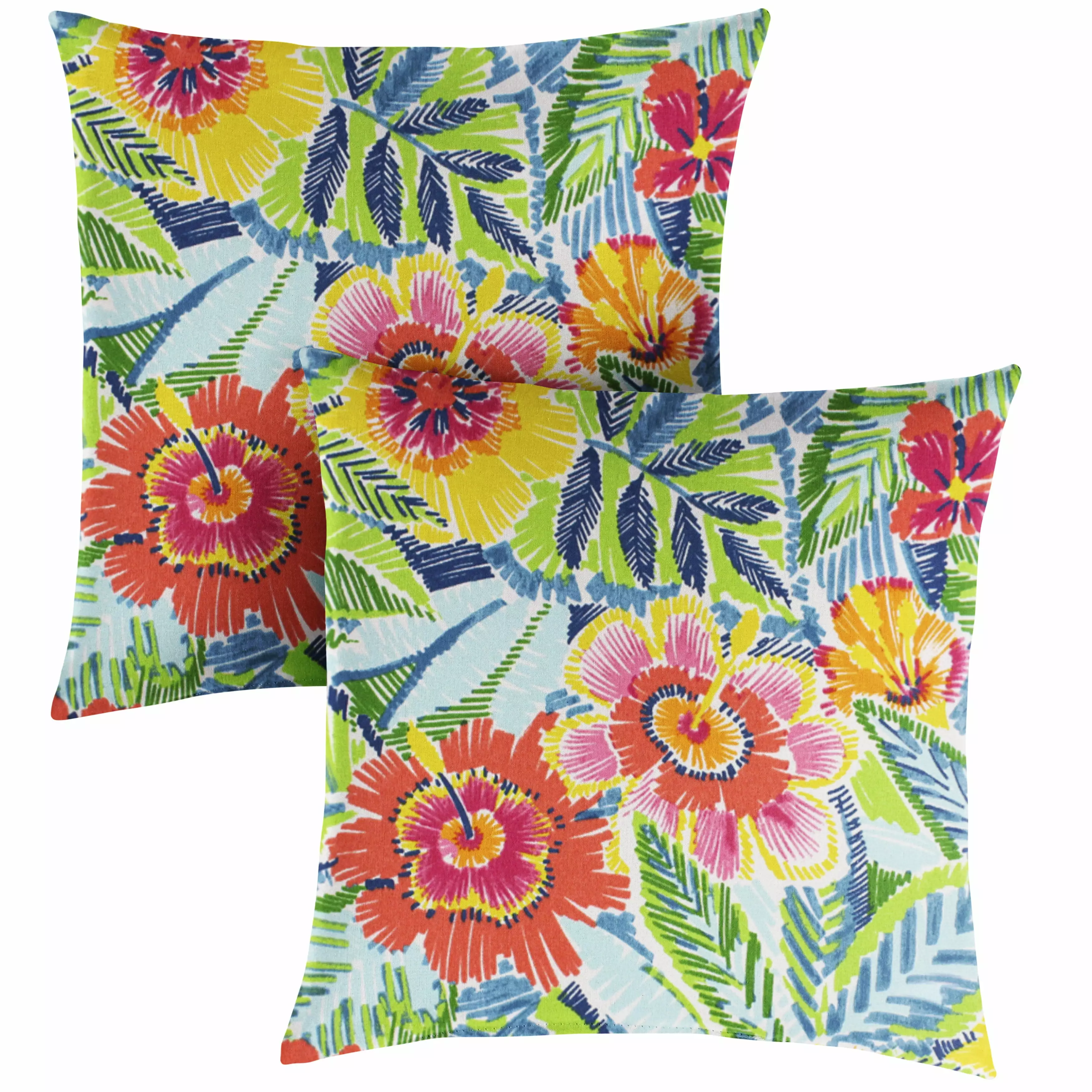 Step out on your porch or patio and start brightening it up with this adorable set of two square pillows! Featuring a rich. Pensacola Multi color hue in a beautiful Floral pattern fabric. this pillow set is sure to add style to your space and help you enjoy the outdoors so much more! Crafted out of a performance material right here in North America. these pillows are made to withstand the sun. rain and even stains so that all you have to do is sit back and relax!