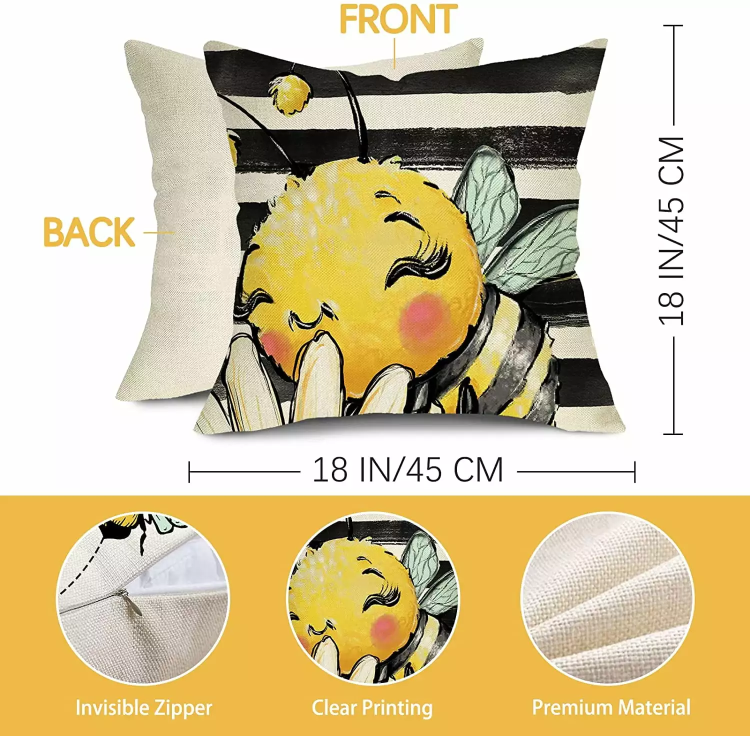 Spring Bumble Bee Sunflower Decorative Throw Pillow Covers 18×18 Set of 4. Summer Farmhouse Black White Stripe Porch Patio Home Decor. Yellow Buffalo Plaid Check Quote Outdoor Couch Cushion Case