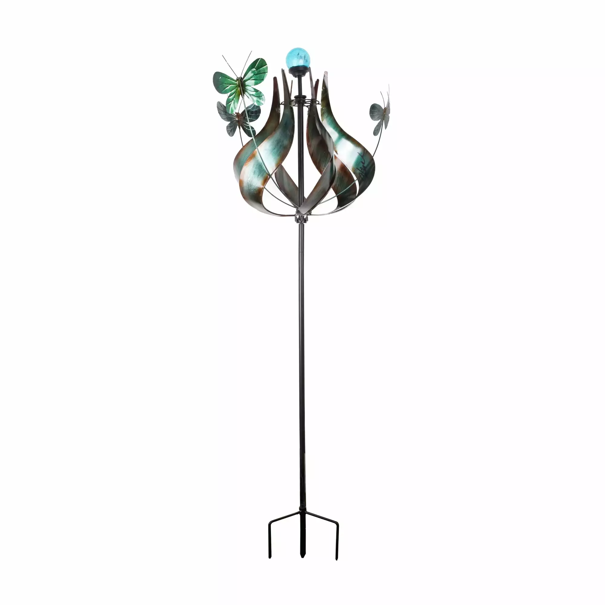 Watch the metallic colors and shapes dance in the breeze with this unique double wind spinner. A dynamic piece of art for the yard. this spinner outdoor decor stands 84.5 tall. This wind spinner with a ground stake is made from dependable iron and features a powder-coated finish. Securely drive the spinner into the ground using the 4-point stake at the bottom of the pole. This impressive outdoor kinetic art piece is easy to assemble. and all the tools and hardware needed for assembly are included. It features two beautifully designed blades that spin independently and can move in both counterclockwise and clockwise directions based on the wind. The top portion of the spinner can also turn 360 degrees if the wind is strong enough. The blades of the spinner are adorned with unique shapes in shades of blue and gold. This modern spinner yard art is a stylish addition to the backyard or garden.