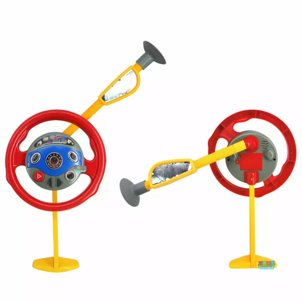 Turnable Steering wheel with lights and sounds;Realistic car sounds: engine starts. 3 gears. breaks. honk. indicators;Includes: left and right indicator lights. hazard lights. and 3 gear lights;Extension with suction cup attaches to side window;Steering wheel measures 9 in diameter Packaging: