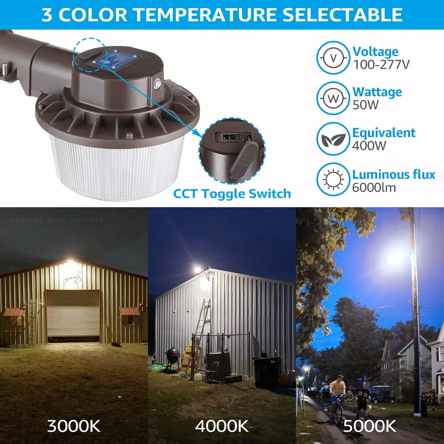 This 3CCT LED barn light comes in three color temperature Settings. 3K/4K/5K. The 6000lm is very bright and has a wide beam Angle of 120??. ideal for illuminating large areas. With more sensitive. accurate photocell. automatic night lights on. automatic day lights off. Replace 400W incandescent lamp. reduce the loss caused by voltage instability.