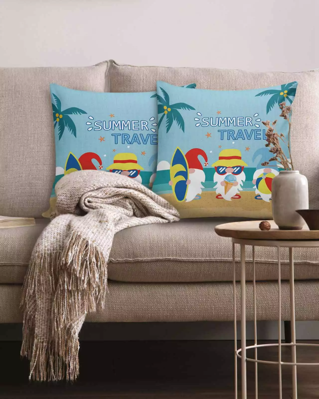 Tropical Beach Gnome 18×18 Pillow Covers Set of 2. Palm Tree Decorations Outdoor Throw Pillow Covers. Cotton Linen Square Pillowcases for Patio Sofa Couch Bedroom Decorative