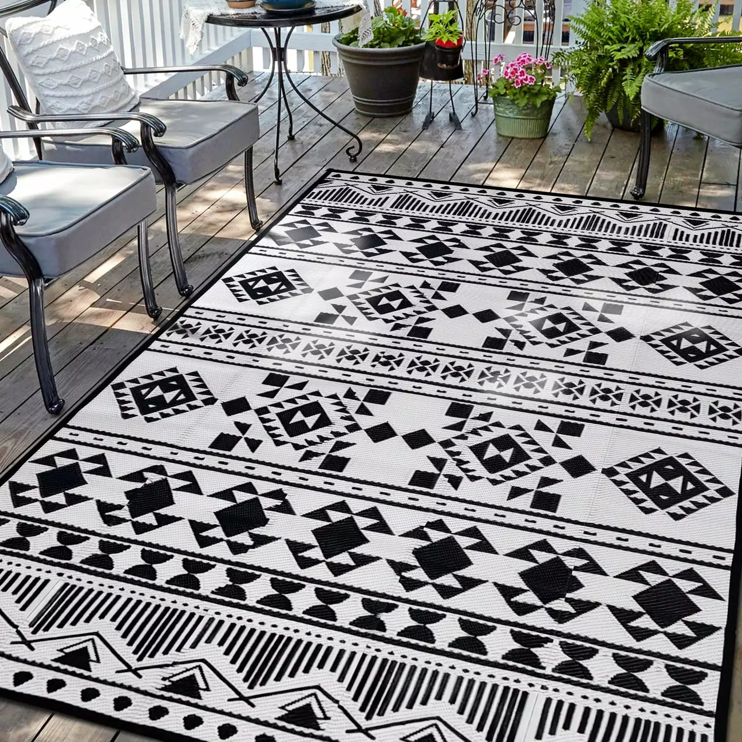 From the Outdoor Coastal Collection. a bamboo-weave-inspired rug with abstract and indigenous patterns. A unique blend of modernity and tribal motifs this rug elevates your outdoor seating ambiance. Featuring a flat pile this polypropylene-backed rug offers all-weather comfort and ease of cleaning. Make an inspired choice and add a splash of old-country charm to your outdoor decor. Product Features: Color(s): ivory. blue and aqua. Machine woven. Medium pile. Backing: yes. Coastal and nautical style rug. Recommended for both indoor and outdoor use. Easy-to-clean. stain resistant and does not shed. Made in Egypt. Care instructions: Spot clean only. Vacuum the rug or you can spray them down with a hose. In case of creases – roll the rug in the opposite direction. while applying pressure to the rug – take the edge. flip it where there is a crease. and slowly pull the rug back. while applying downward pressure on the crease. Dimensions: 7.8′ wide x 7.8′ long. Pile height: 0.16". Material(s): polypropylene. Backing: polypropylene