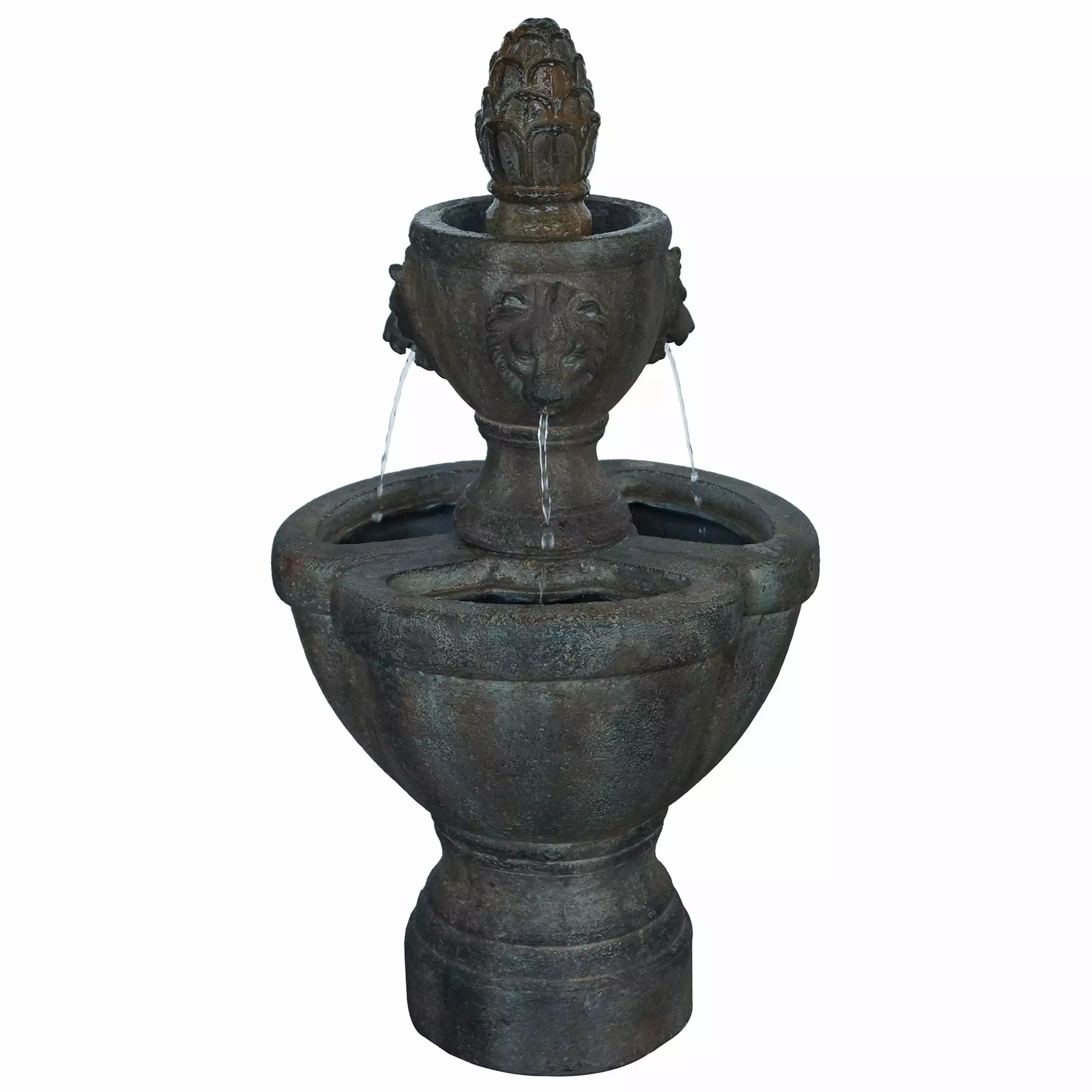 The Villacera 2-Tier Lion Head Fountain will let you enjoy the tranquil sounds of running water while you relax in your own backyard. The 32-inch-tall antique style fountain features. a pineapple accent on top. levels that the water flows through down into the lower reservoir. and a polyresin construction with a natural stone-look that is designed to withstand the outdoor elements. Setting up this water fountain is simple ÿ fill the reservoir with water. plug in the 118-inch-long cord. and the included submersible pump with a 93gph flow will circulate the water creating lovely Decor piece to your porch. patio. deck. or any garden space!