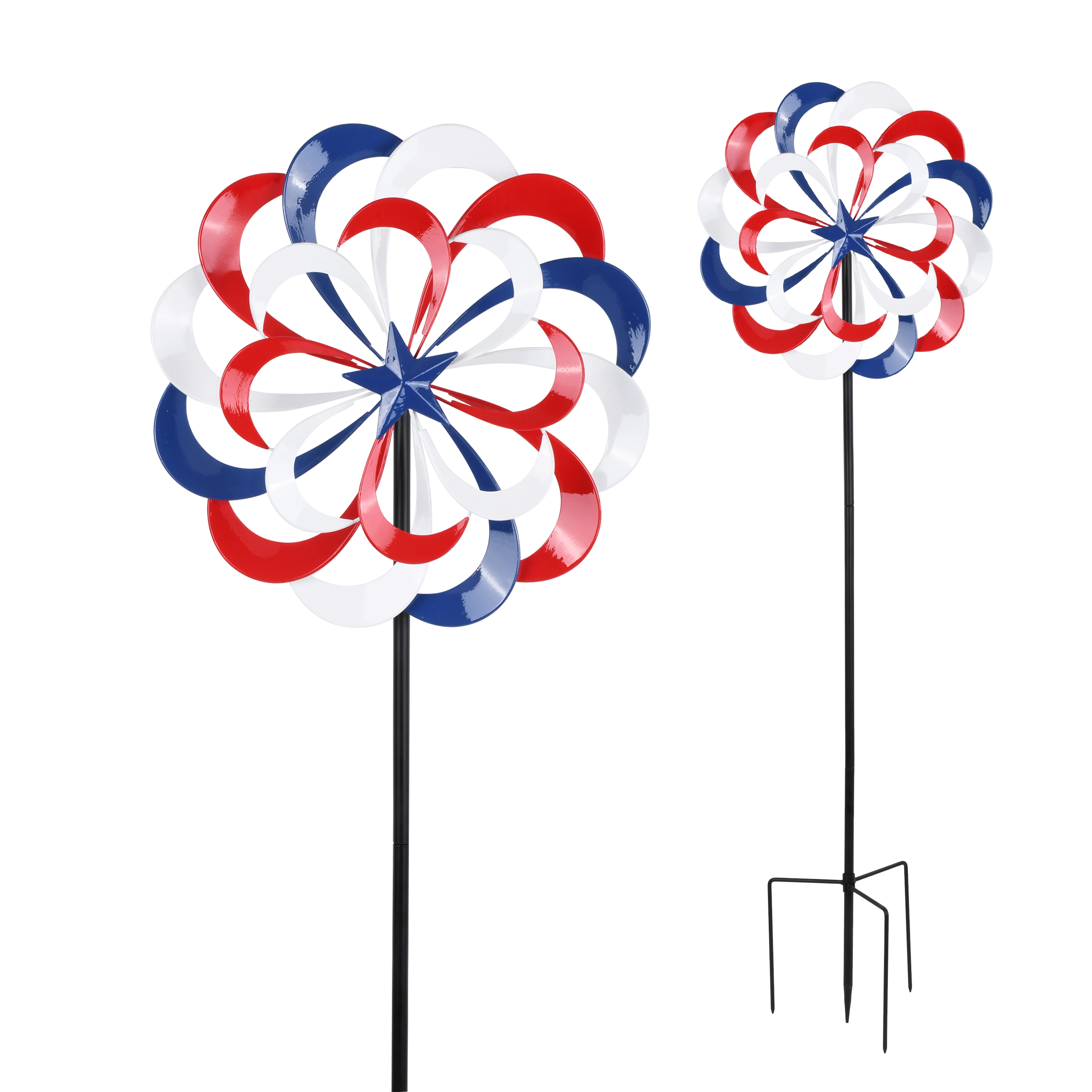 The Way to Celebrate 49.4"H Patriotic Metal Flower Wind Spinner adds a fun decorative element to your outdoor space. It’s made of a durable metal material with a powder coated finish that allows it to withstand the elements for year-round use in your garden. lawn. or patio. This wind spinner has a solid metallic construction with easy spinning leaves-shaped blades. Through reversible dual ball bearings. the pair of blades spin in opposite directions simultaneously. The Way to Celebrate 49.4"H Patriotic Metal Flower Wind Spinner has a three-pronged stake to keep the device more balanced and stable under strong winds. Meanwhile. low friction bearings allow the wind spinner to spin freely at low wind speeds. The Way to Celebrate 49.4"H Patriotic Metal Flower Wind Spinner is the perfect addition to any outdoor space!