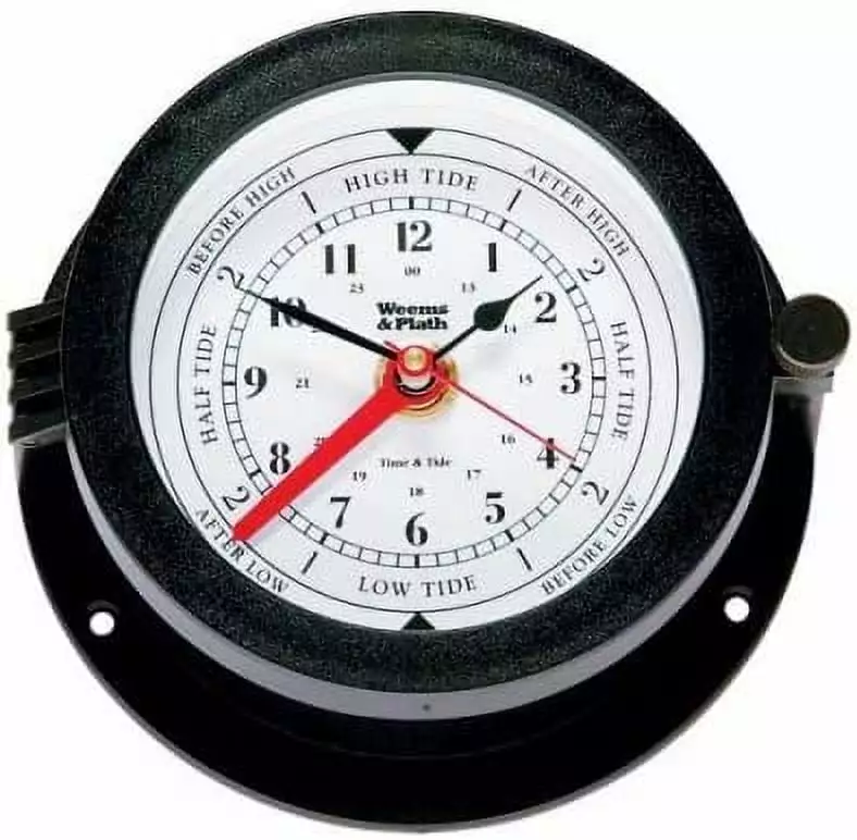 The Blue Water Quartz Time & Tide Clock is an affordable time and tide clock that can withstand the outdoor elements. Housed in a black. splash resistant resin case. this rugged quartz clock accurately displays both time and tide. The red hand points to the rising or falling tide. The time is indicated with black hour. minute. and second hands.