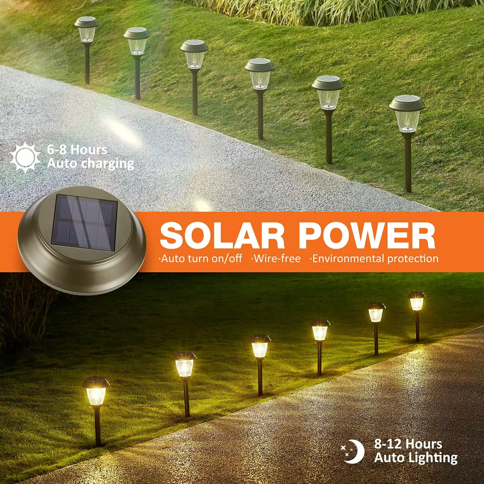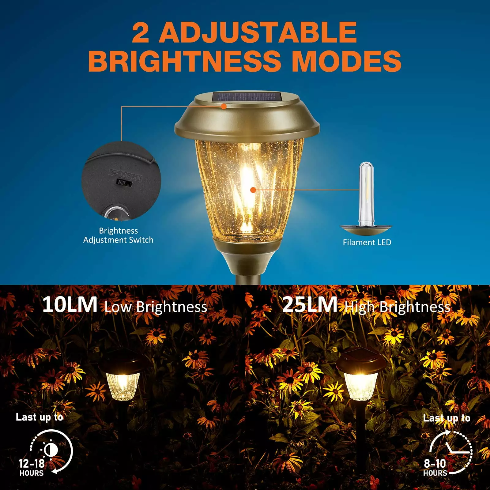 With a special bubble glass lampshade. 10-25 Lumens adjustable brightness (High/Low lighting mode). high-efficiency larger solar panel. XMCOSY+ outdoor waterproof solar path lights. perfect for decorating your home’s garden. pathway. patio. lawn. driveway. walkway. path. backyard. balcony. or everywhere outdoor.[??SOLAR POWERED & ENERGY-SAVING] Our outdoor solar lights pathway waterproof feature a 0.55W polycrystalline solar panel that converts solar energy into electricity on a large-capacity 1000mAh 1.2V rechargeable battery. They turn on automatically at night and turn off at dawn. saving you money on electricity bills. The LED outdoor lights are wireless. eco-friendly. No worry about turning on/off the light outside anymore. | [??UNIQUE DESIGN FOR A UNIQUE AMBIENCE] With a LED tungsten filament. bronze-finished stainless steel body. and bubble glass lampshade design. our super bright solar lights provide a 360° radial ambient warm lighting effect at night and create a unique star pattern on the ground. The antique bronze finish adds visual harmony to your walkway. patio. shrubbery. or any outside area. as a simple way to update the porch appeal of your house. Product Dimensions: 5.12"L x 5.12"W x 19.09"H. | [??HIGH LUMENS & BRIGHTNESS ADJUSTABLE] Our solar led outdoor lights provide a 10/25 LM brightness mode adjustment on the switch panel. lighting up your garden. pathway. driveway. flowerbed. yard. or patio for 8-16 hours. illuminating stay from Sunset to Sunrise. They are brighter and last longer than other 1.2 LM solar path lights. and you can adjust the brightness to suit your needs and usage. Lifetime Expectancy up to 30.000 hours. | [?? ALL-WEATHER RESISTANT & STURDY] Our solar garden lights are made of anti-rust coated stainless steel material and have an upgraded IP65 Waterproof grade. allowing them to keep lighting on rainy. stormy. frosty. snowy days. or any complex outdoor condition. Our upgraded ground spikes made of ABS plastic provide better stability and sturdiness. | [??EASY INSTALLATION & NO WIRING REQUIRED] Simply connect the Glass Lighting Fixture. Stainless Steel Connection Tubes. and ABS Reinforced Ground Spikes. and gently place the stakes into the ground. Turn on the switch under the light cover the first time. and enjoy the romantic lighting atmosphere they create. Yard lights can be flexibly more suitable brightness to light up your garden. pathway. driveway. flowerbed. yard. or patio based on your needs and usage of outdoor decorative environment.