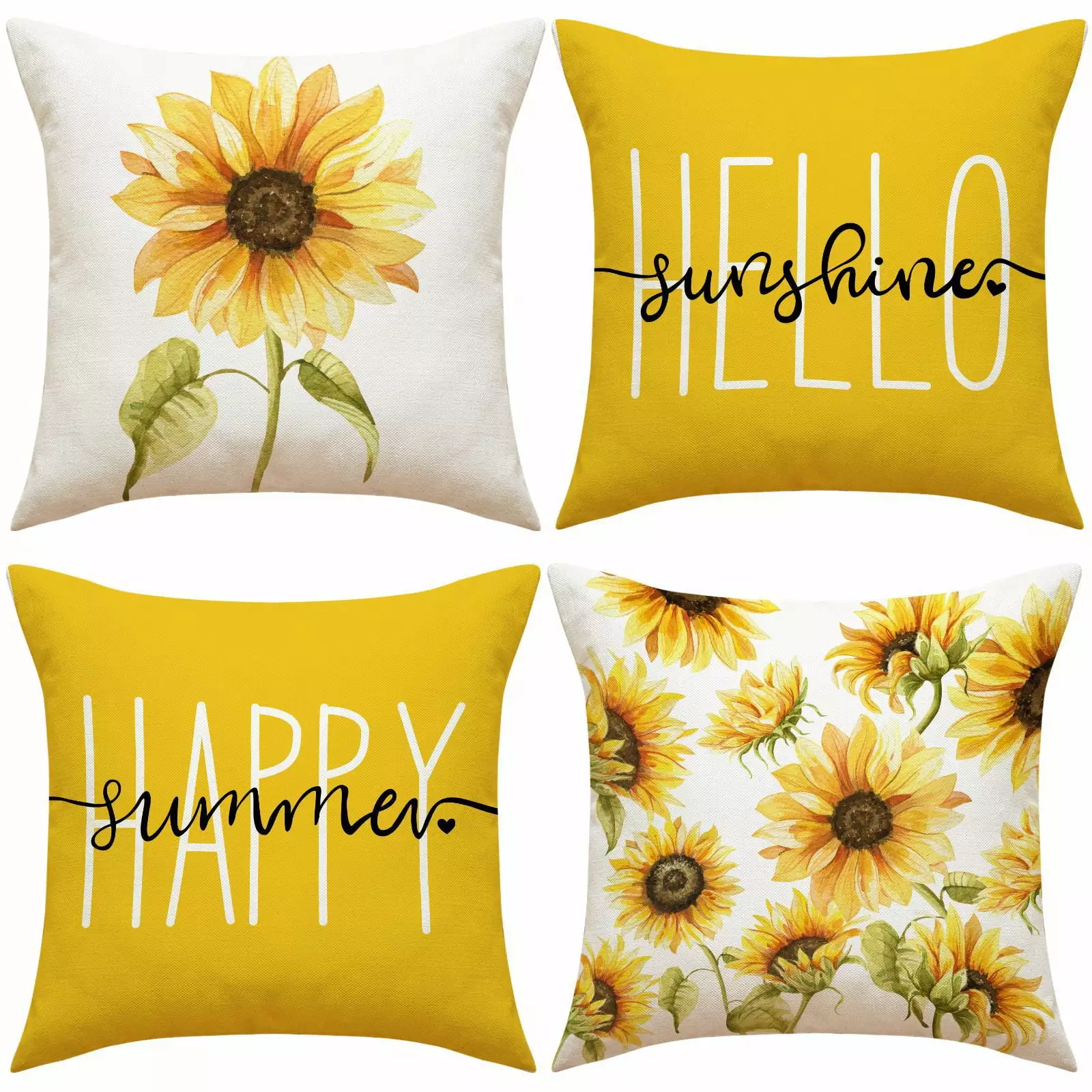PISONIC Hello Sunshine Sunflower Throw Pillow Covers 18x18 Inch Set of 4. Happy Summer Sunflower Cushion Case Decoration Farmhoutilize Decor for Couch Sofa